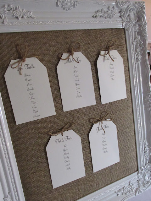 The table plan was made from a large frame that we covered the insert of the frame with padding and burlap to pin the luggage tags onto.