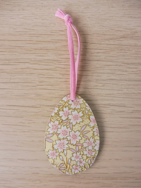For my first egg decoration I used the Japanese Chiyogami paper (which we had bought previously from ArtCuts) and followed their YouTube video on how to apply the paper. This is such a simple and effective way to cover your wooden decorations, and then you can match it up with a complimentary ribbon for hanging.